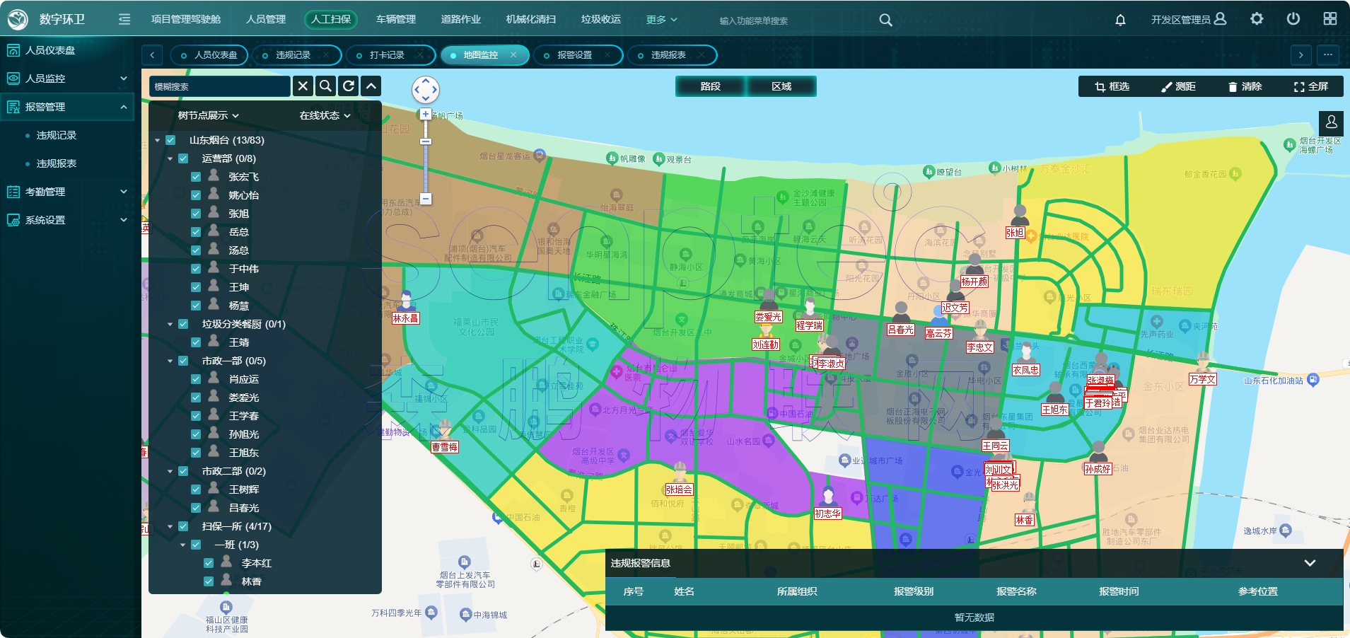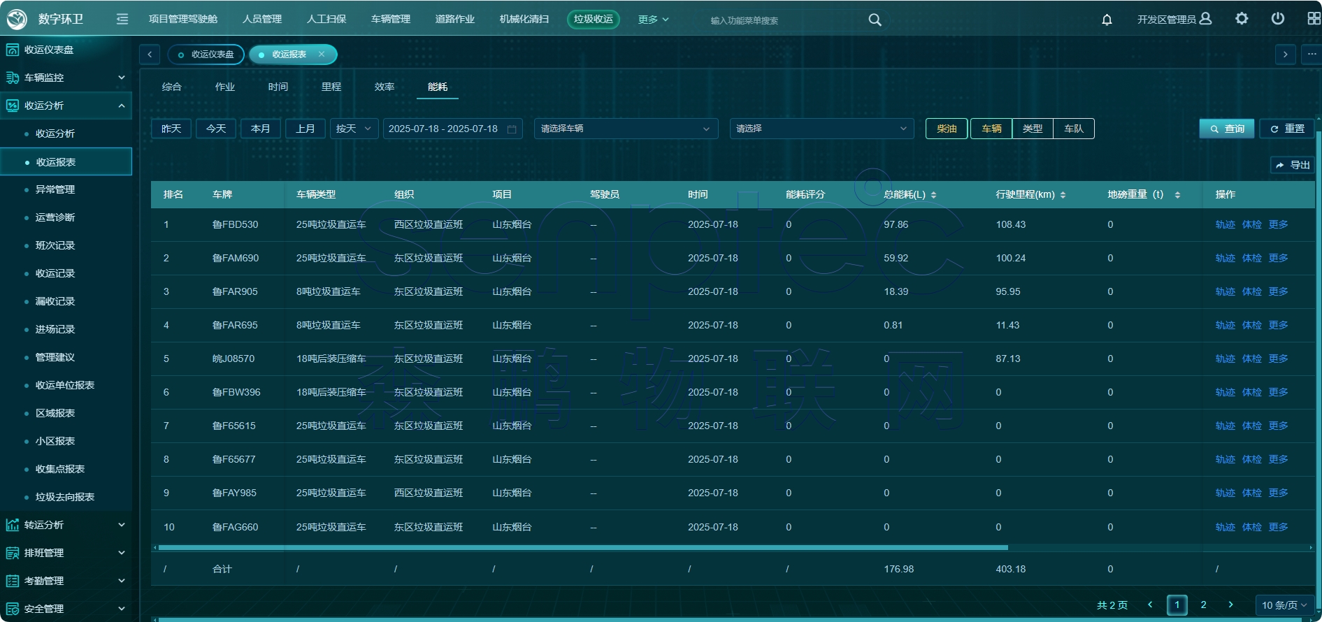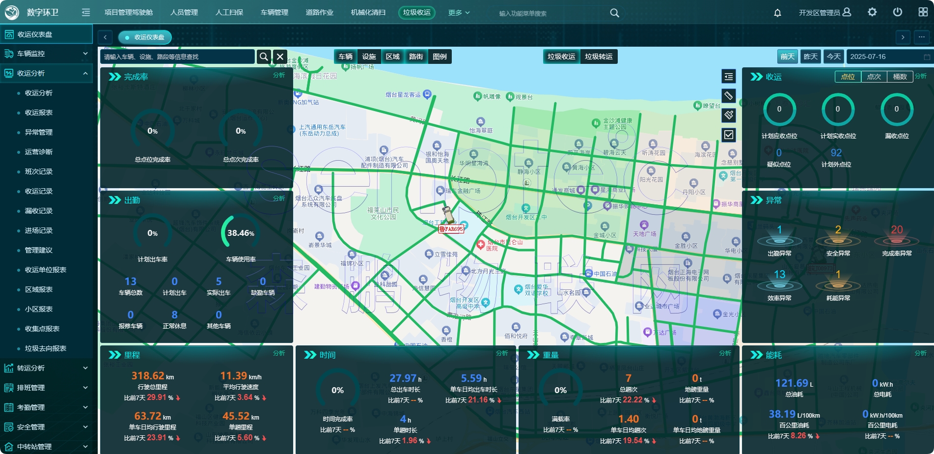 直观呈现收运过程信息,车辆轨迹、垃圾收运点(商户信息)、收运垃圾量、漏收记录、行驶里程、运行时长、超车停车违规、驾驶违规报警等信息。