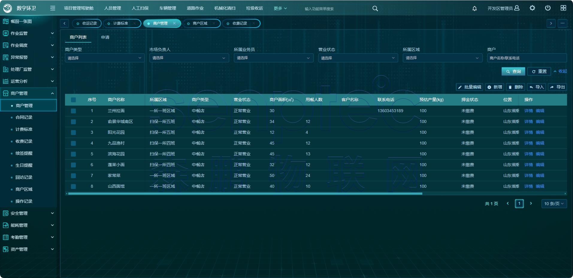 系统总设计功能26个,各种展示页面89个,各种统计报表68个,为政府、收运企业、商户三方展示真实的应用场景、准确的数据还原。